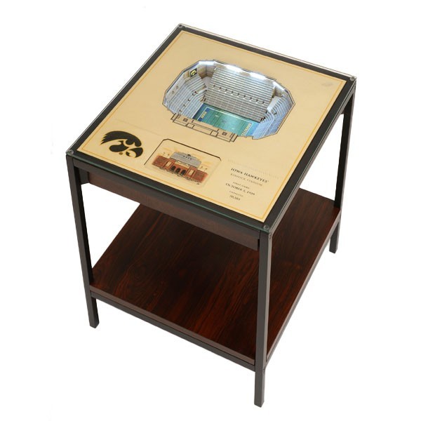 Iowa Hawkeyes Kinnick LED Table is a Lighted End Table makes a glowing addition to your den, game room or fan cave. We take twenty-five layers of engineered wood and assemble to create a three-dimensional work of stadium art. Then we add LED lights that specifically match the actual lighting of your team's stadium. The entire piece is suspended in a black, powder-coated, heavy-duty metal frame, topped with a 1/4" thick piece of tempered glass, and finished with a wood laminate lower shelf. It all comes together, out of the package, with just eight screws. Dimensions: 23" L x 22" W and stands 22.25" H. Made by You The Fan.