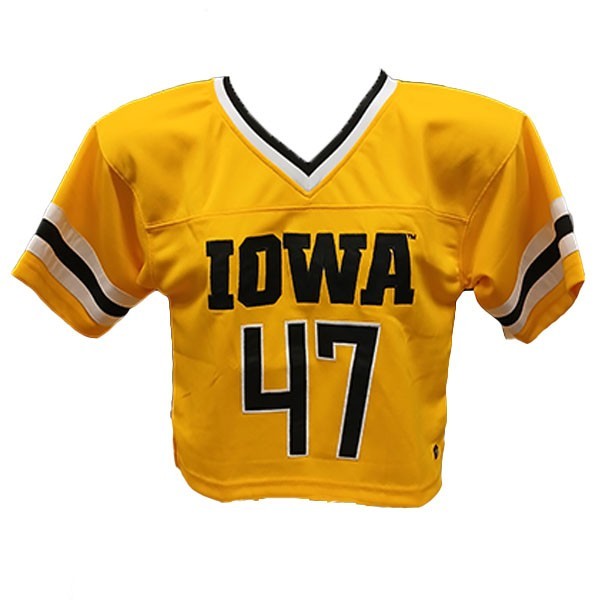 Be prepared for the Football season with this Iowa Hawkeyes Women's Football Jersey. This cropped jersey come in you choice of black or gold and has IOWA 47 stitched on the front. 100% polyester. Made by Hype and Vice.