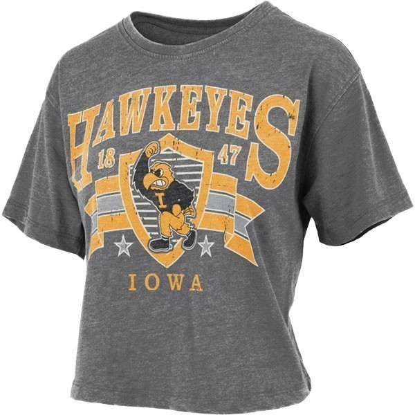 The Iowa Hawkeyes Women's Windsor Top will be a Fan favorite. This grey waist length top features HAWKEYES, 1847, IOWA with a punching Herky in the middle. 5% cotton and 45% polyester. Made by Pressbox.