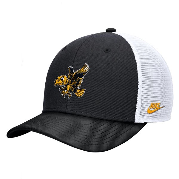 The Iowa Hawkeyes Rise Trucker Hat is perfect for the Spring. This black hat features a flying hawk on the front, with a white adjustable mesh back. Comes in M/L, L/XL sizes. Comes in black, grey and gold. Made by Nike.